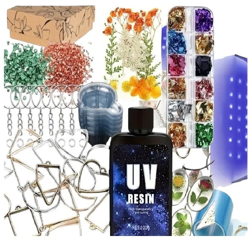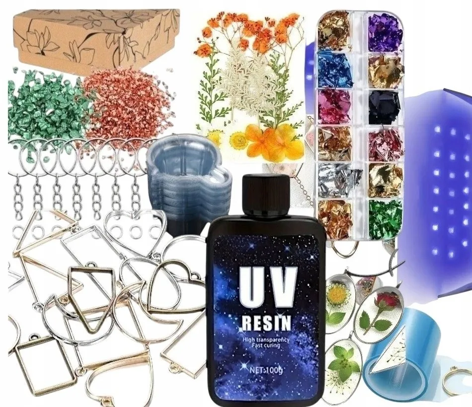 Zestaw waży ok. 500 g. Zawiera lampę UV 12 W, słoiczek z żywicą, formy silikonowe, zawieszki, łańcuszki i łyżeczki do mieszania. Przechowuj żywicę w chłodnym, ciemnym miejscu. Nie wystawiaj na długie działanie światła słonecznego.